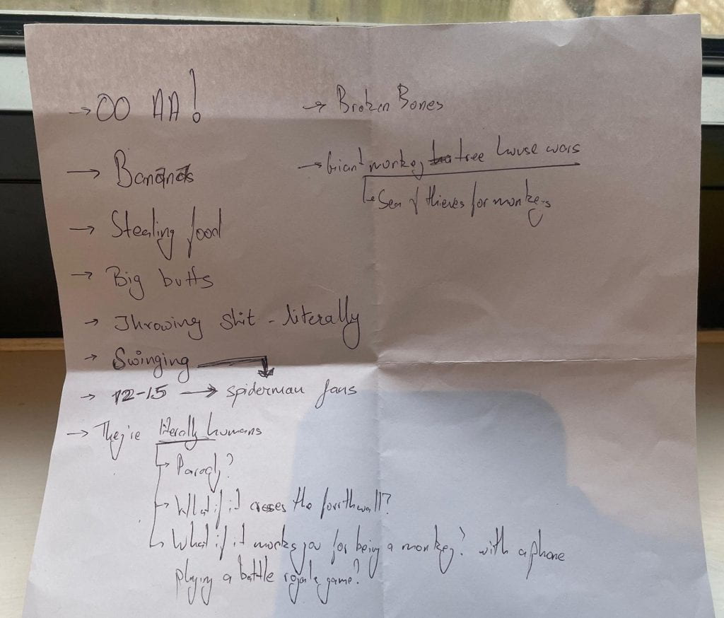 The notes on the different things started leading to some abstract concepts, the first one was about swinging, what if you could make a game that focused on the verticality/ swinging through trees nature of monkeys? Like spiderman but with monkeys and battle royale mixed.