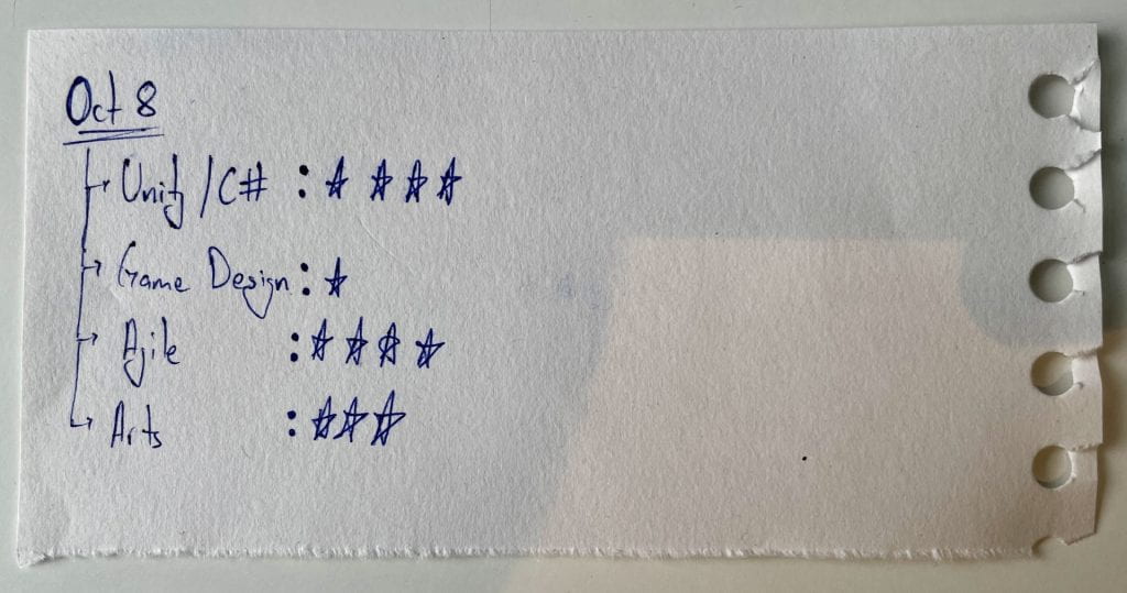 I just had an idea while I was writing this, maybe it’s really stupid, but I thought it’s worth trying anyway. Here’s a little report card on how much progress I’ve made on individual things. I think I’ll come up with a more accurate way to rate myself over the week, need to figure out what having a certain number of stars means…
