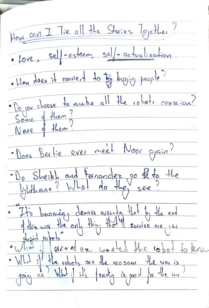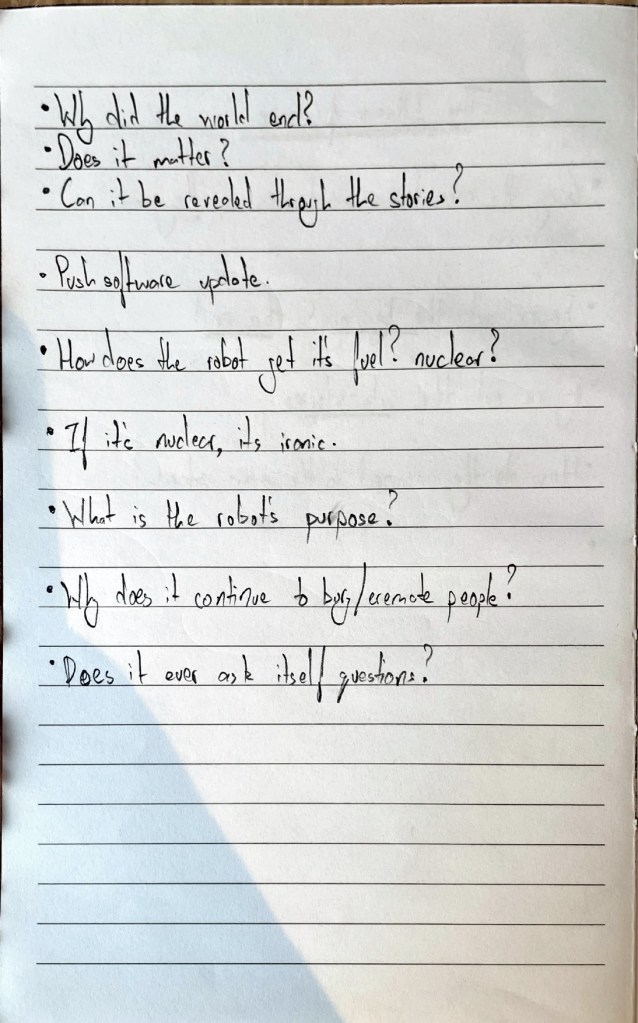 I began to think about this sort of Wall-E archetype. The world has ended, and for some reason its your job to clean up the corpses left behind. You don’t know why you do it, you just do. And I wanted to mix it in with this sort of Chappie idea about injecting consciousness into a machine.