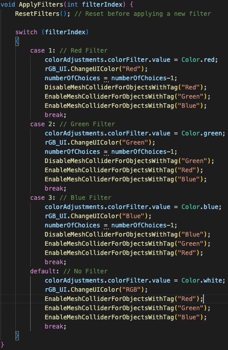 Most of the code was controlled using a ‘ApplyFilters’ function, which was a switch case which alternated the colour filter based on the ‘interact’ button.