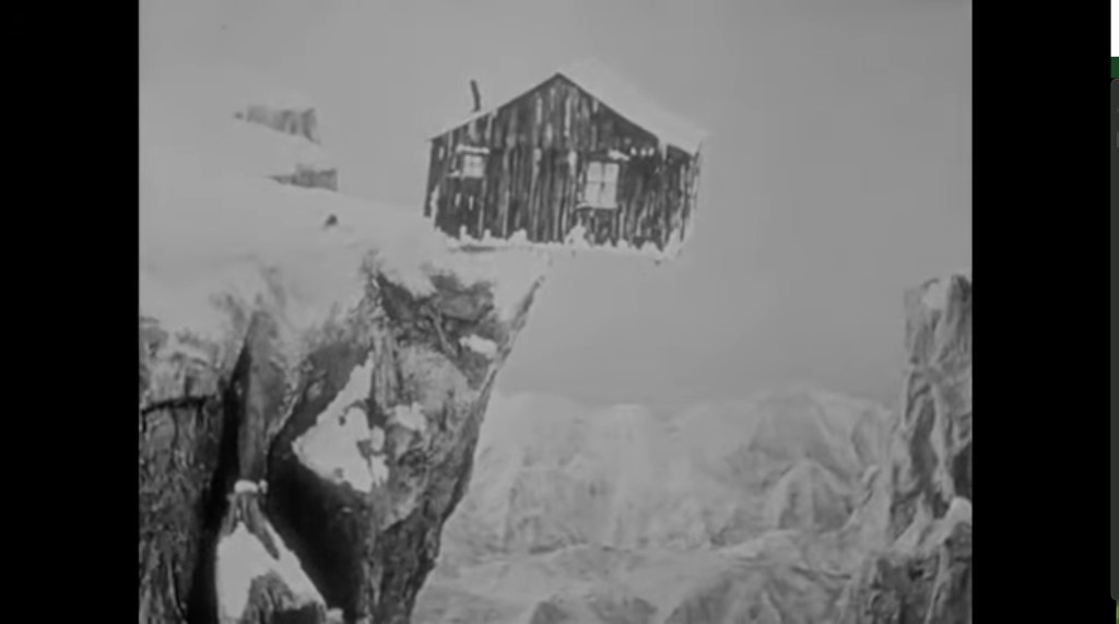 There’s these two travellers who were searching for gold in a snowy mountain cliff. They take shelter in this little brittle cabin, the snow picks up and the whole cabin is pushed to the side of the cliff.