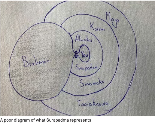 My main inspiration for this, was kurtzgesagt’s ‘The egg’ video(‘(5) The Egg – A Short Story – YouTube’ 2025), which is based on an older video by Andy Weir(The Egg – by Andy Weir 2012), which focuses on a simple philosophy behind reincarnation that is more aligned to the Hindu philosophy, and more importantly, a video from Karuna Sagari’s channel(‘(212) What Does Surapadma and His Brothers Represent? – YouTube’ 2024) where Dr. Sudha Seshayyan talks about what the demon ‘Surapadma’ and his brothers represent in Hindu literature.
