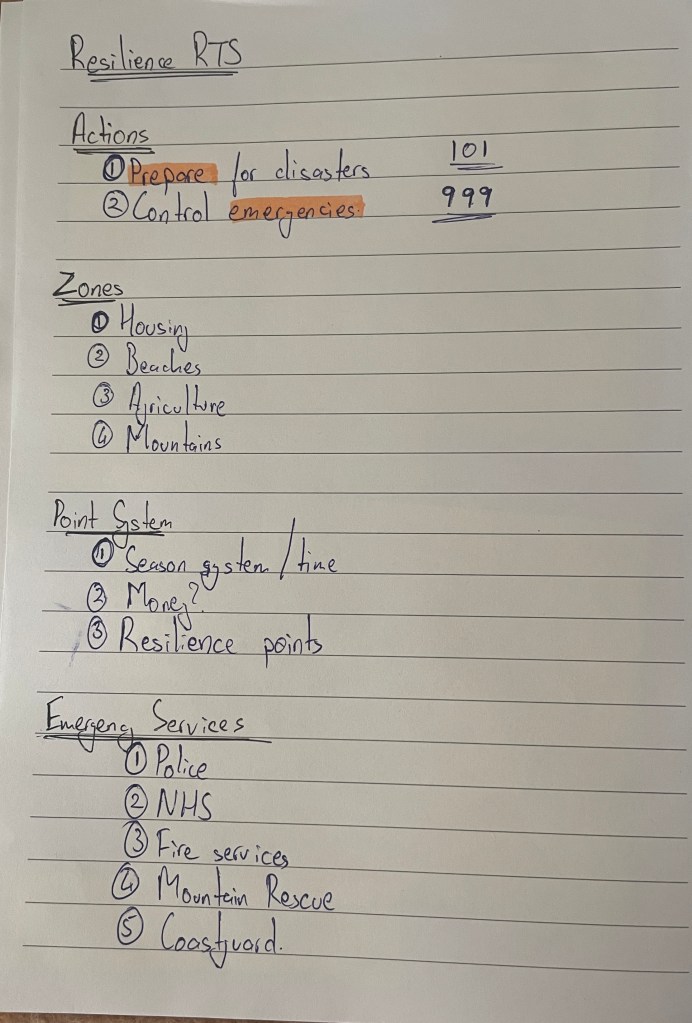 We started with listing down all the elements, verbs, actions and other things that our RTS game could have. This eventually meant 4 different groups : Actions, Zones, Point System and Emergency Services.
