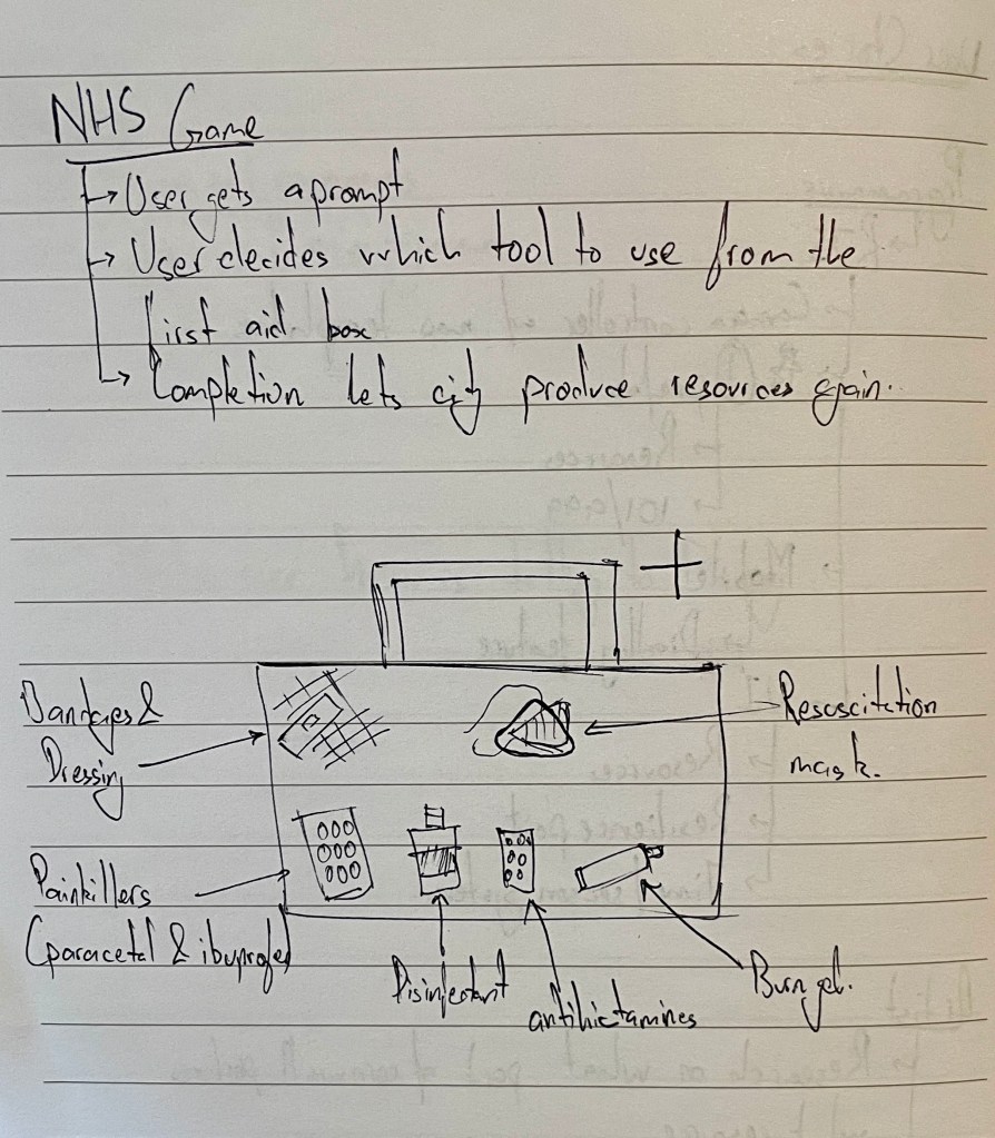 I helped with coming up with the ideas for the NHS and the Fire fighting mini games. Since we had 5 designers, the task of creating GDDs for each of the games got split between the 5 of us, I was in charge of creating the GDD for the NHS mini-game.