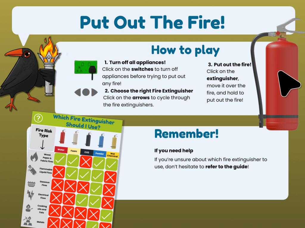 - Firefighting — Aims to teach kids about the different kinds of fire extinguishers using drag and drop mechanics