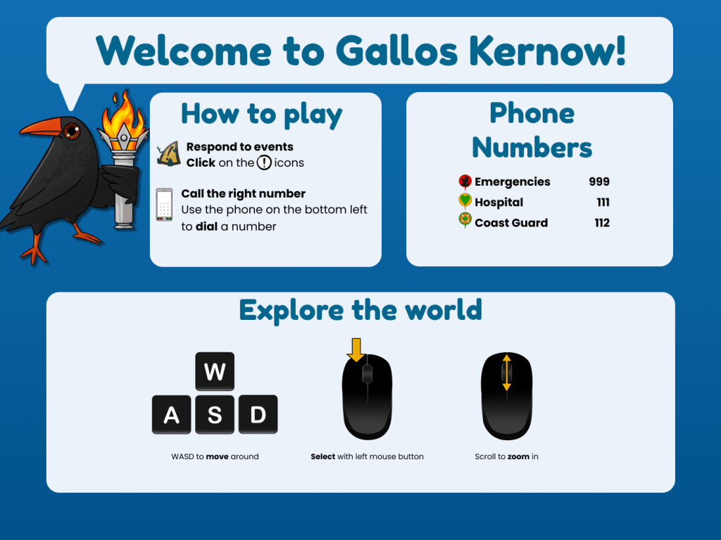 Another big contribution I had to this project was to make the tutorial sheets for all the different games. The tutorial sheets were designed to be extremely simple and easy to understand, and use the chough mascot to make them child friendly.
