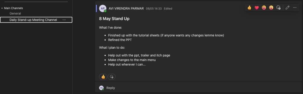 The daily stand-ups were set up as a separate channel on teams, where all team members were requested to make an entry everyday.