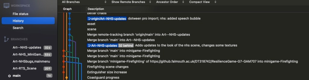 Thankfully, all went well, and I learnt a lot of version control. I was able to create my own branches, and contribute to the art of the game, and for any future presentations to the project supervisor, or for play testing purposes, I could pull and compile the latest version of the game immediately, without having to ask the programmers for a build.