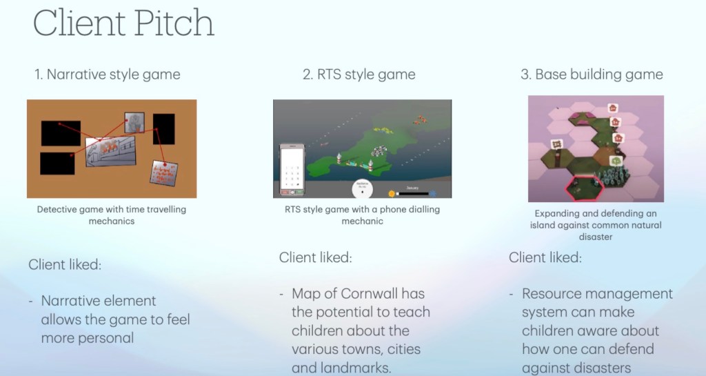 The idea was to pitch multiple different ideas, and see which ones resonate with our client more, so we have a better understanding of what kind of game the client is expecting.