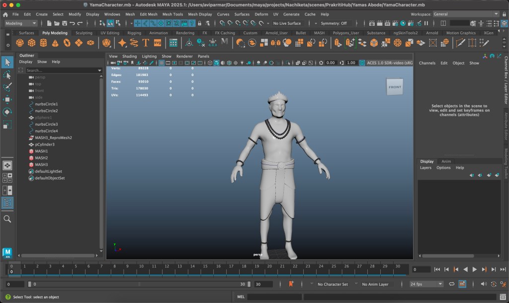 Modelling started with a base biped mesh available inside Maya. The mesh was first sculpted, and then retopologised.