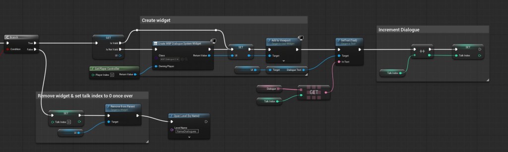 One common mechanic that got replicated through all the NPC characters, was the dialogue mechanic. The dialogue mechanic worked using a ‘dialogue’ text array, an ‘index’ integer, and a ‘UI’ UI widget reference object. Every time the player character pressed the interact button, the index would go up, printing the text from the dialogue array to the UI widget.