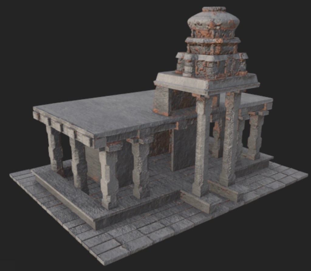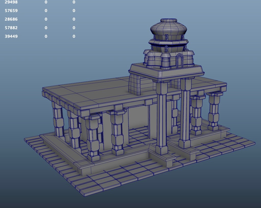 The temples were modelled on Maya using poly modelling techniques without any organic modelling techniques (like sculpting).